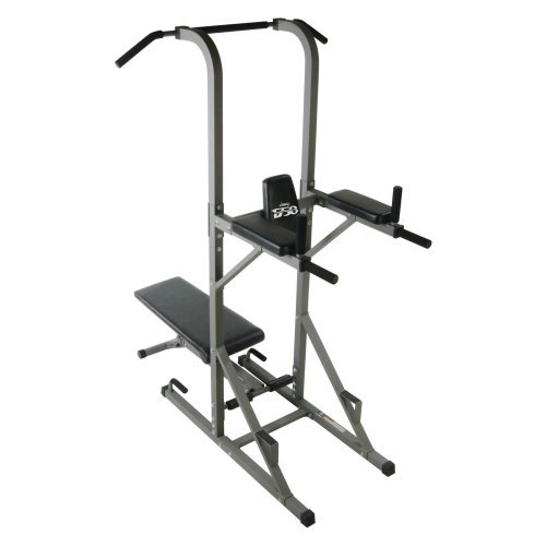 Multi-station pwer tower and multi-position adjustable bench for strength training at home. Dip station for triceps, back, chest, shoulders. Sit-up/crunch station for abs and midsection. Push-up station to strengthen chest, triceps, back and abs.Ankle pads for bench incline sit-ups. Four bench incline/decline angles: 10 degrees, 15 degrees, 18 degrees, and 28 degrees. Push-through bench.